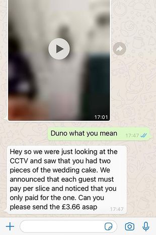 The guest shared screenshots of the conversation, showing the couple had sent CCTV footage with the message: “Hey so we were just looking at the CCTV and saw you had two pieces of the wedding cake.