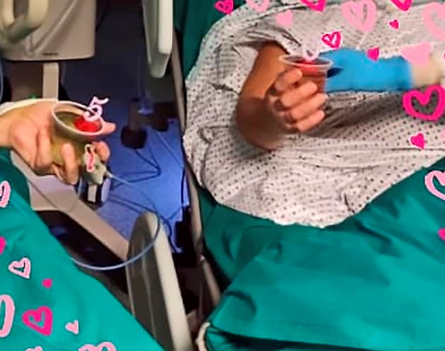 In one photo taken by healthcare workers, the couple is seen holding hands in the presence of medical staff who made their celebration possible.