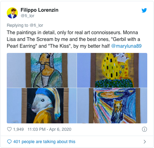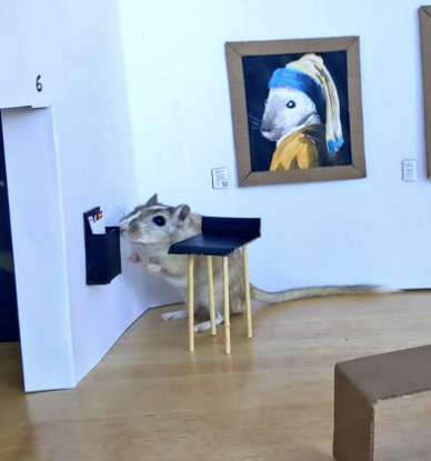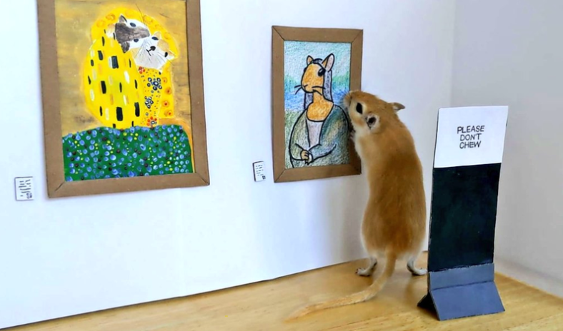 Just like many us, he is also stuck at home, but he decided to pass his time by bringing a little culture for Pandoro and Tiramisu, the nine-month sold gerbil brothers by creating a small gallery exhibit. As an individual who loves art exhibitions, he knew what to do.