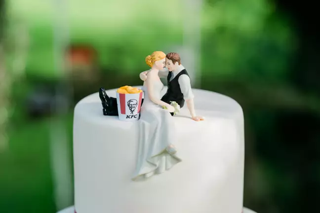 The wedding also featured a KFC-themed wedding cake, KFC buckets, a KFC Food Truck, a photo booth, and a Colonel-style singer.