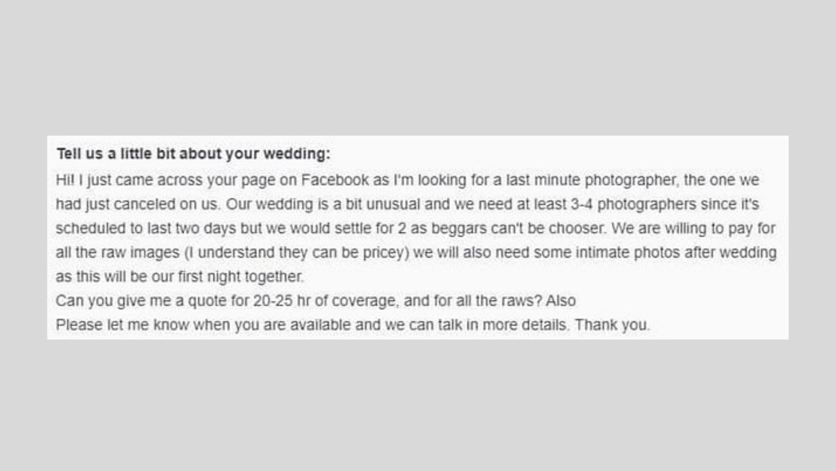 “We are willing to pay for all the raw images (I understand they can be pricey). We will also need some intimate photos after (our) wedding as this will be our first night together. Can you give me a quote for 20-25 hours of coverage, and for all the raws?” the bride added to her request.