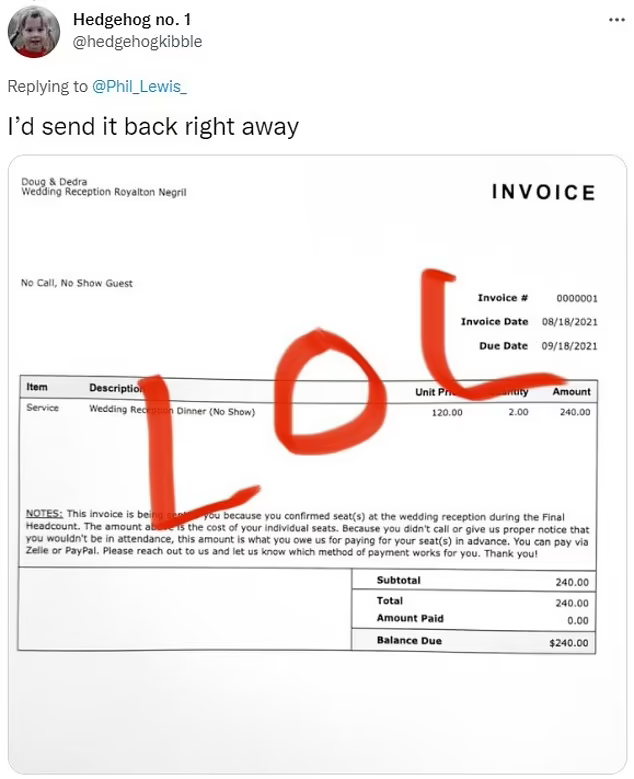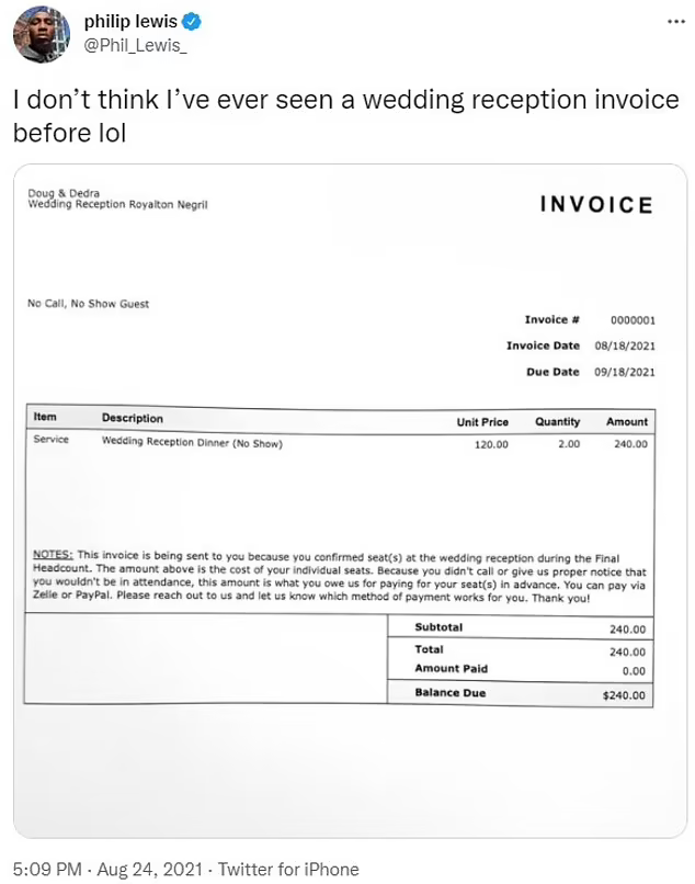 But when guests failed to show up on their big day, the couple sent them an invoice for the $240 they wasted.