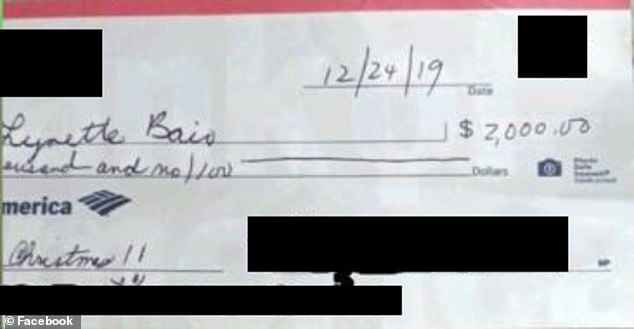 They left a check and also a message that read: ‘Merry Christmas and restore your savings. God bless you.’