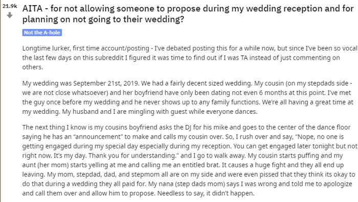 Her cousin started crying and her aunt started yelling at her for being ‘an entitled brat’. Her family also scolded her for not allowing her cousin’s boyfriend to propose her on her big day.