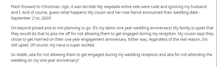 ‘My cousin says they chose to get married on their one year engagement anniversary. Either way, regardless of the real reason, I’m still upset. Of course, my nana is super excited.’