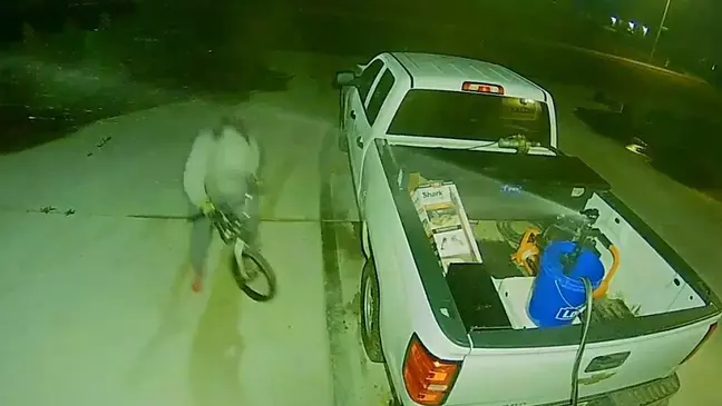 A video shared by Katie on Facebook shows a kid cycling down to her pick-up standing on their driveway. As the kid approaches the vehicle, the sprinkler starts its action, soaking him.