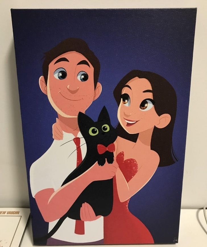 14. “For Valentine’s day, my girlfriend ordered an illustration of us and our cat.”