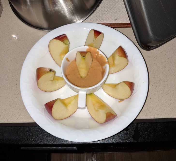 9. “Every night, my wife wakes up to breastfeed my son, she asks for the same delicacy. Behold, peanut butter apples at 3:00 AM.”