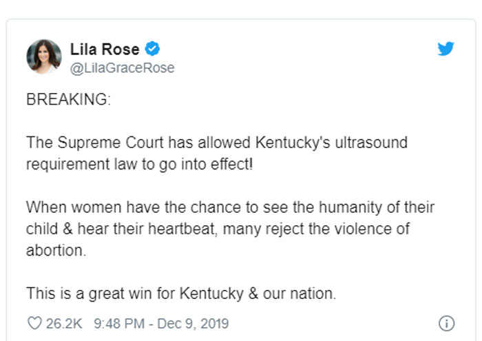 Live Action founder and prominent pro-life advocate Lila Rose shared the news on her Twitter account that the Supreme Court has allowed Kentucky’s ultrasound requirement law to go into effect.