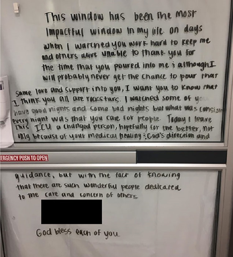 “I watched some of you have good nights and some bad nights, but what was consistent every night was that you care for people,” his heartwarming note continued. “Today I leave this ICU a changed person, hopefully for the better, not only because of your medical healing and God’s direction and guidance but with the fact of knowing that there are such wonderful people dedicated the care and concern of others.”