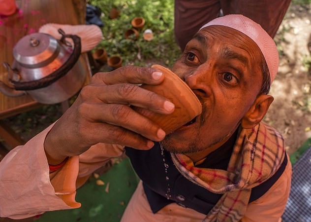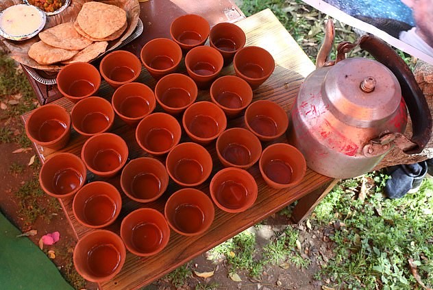 As seen in the photos, people were downing cow urine that was placed in small ceramic and paper cups.