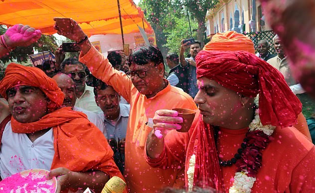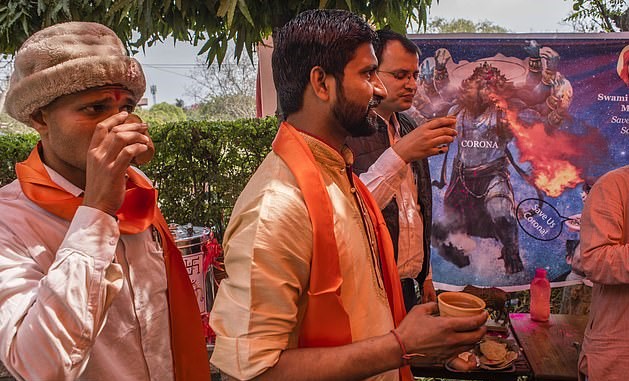 Posing for photos with a cup of cow urine was also the chief of the group which came up with their own depiction of coronavirus.