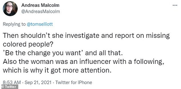She also added that there was a list of missing people of color who have gone missing but there’s no one to ask or document their stories because they’re not white. “They fail to generate a fraction of the attention that’s being given to the Gabby Petito case,” she fumed.