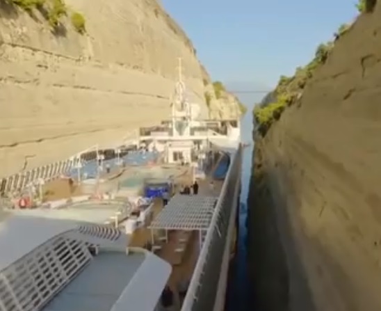 A giant cruise ship was caught on camera passing through a narrow canal and breaking the record by becoming the largest vessel to ever pass through the Corinth Canal.