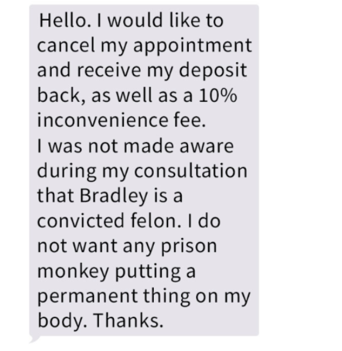 This customer did just that to the point that he even researched the background of the tattoo artist. However, he didn’t like the results, and he decided to cancel the appointment in a judgmental and snooty way. He even demanded an inconvenience fee. Who does that? Only this guy for sure!