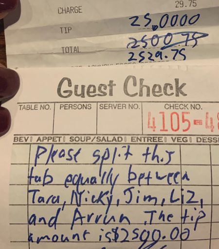 “Please split this tab equally between Tara, Nicky, Jim, Liz and Arrun. The tip amount is $2500.0,” it reads.