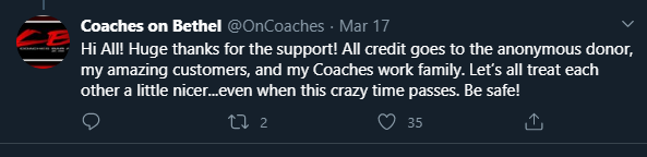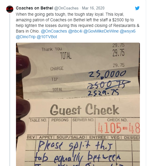 Sharing the amazing experience on Twitter, Coaches on Bethel wrote: “When the going gets tough, the tough stay loyal. This loyal, amazing patron of Coaches on Bethel left the staff a $2500 tip to help lighten the losses during this required closing of Restaurants & Bars in Ohio.”