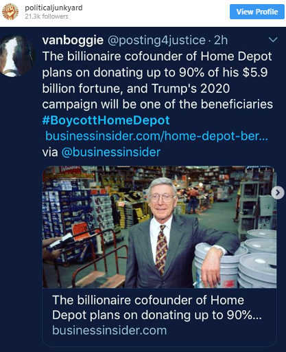 Now customers have decided to boycott Home Depot in order to stop him from investing the money in Trump’s campaign and giving him more power.
