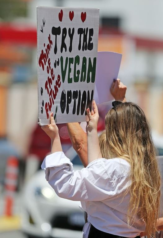 Using a megaphone and waving placards as they gathered in front of the shop, the vegans chanted: “It’s not food, it’s murder.”