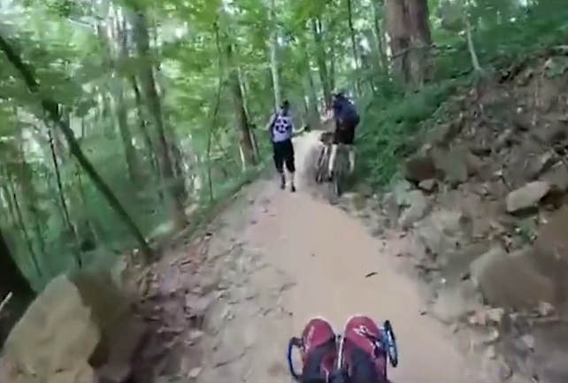A cyclist has been caught on camera confronting and reprimanding a disabled man after seeing him ride on his adapted bike.