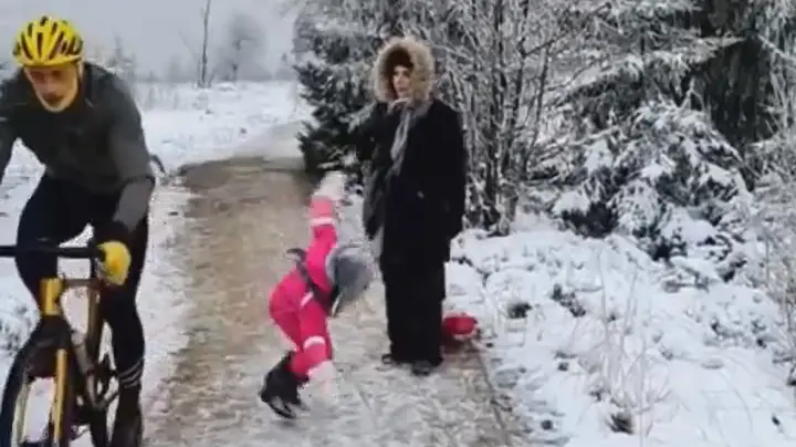 The video shows the young girl walking with her mother on a snow-covered path as the man approaches from behind.