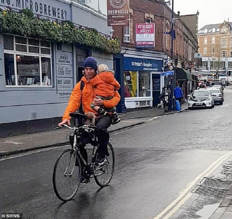 As they cycle through the car-lined street, the child is totally calm and unfazed by the danger it’s in. The pair seem to have had a narrow escape as a silver Honda was observed pulling out of a parking slot just as the man on the bicycle passes it.