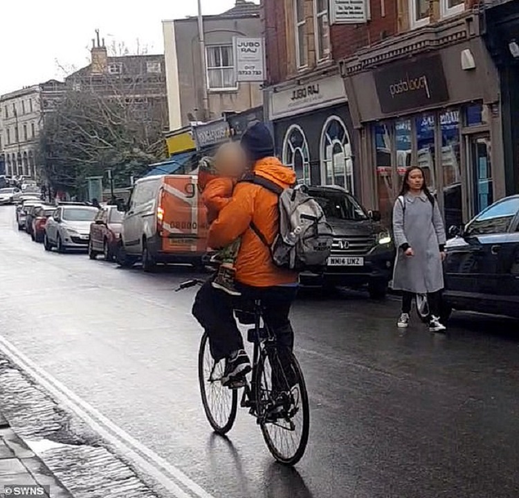 People have been slamming a “reckless” cyclist over footage that shows him riding his bicycle while holding a small child in one arm and with both of them without helmets.