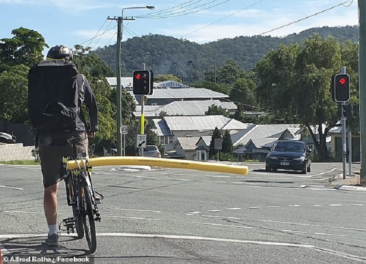 Which is why one cyclist’s attempt to keep drivers at a safe distance has caught the attention of social media users. Alfred Botha, who owns a building design company, came upon a bizarre sight in Bardon in north-west Brisbane where he saw a cyclist stopped at a red traffic light at 10 am on Monday. What caught Botha’s attention was the fact that a swimming pool noddle was strapped to the back of the cyclist’s bike.