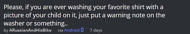 He then shared a photo of his child’s picture pressed against the washing machine door and wrote on Imgur: “Please, if you are ever washing your favourite shirt with a picture of your child on it, just put a warning note on the washer or something.”