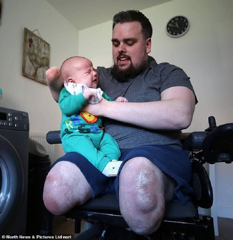 He has gotten used to having missing limbs, normally using prosthetic legs and an electric wheelchair during daily life, but when he became a first-time dad earlier this year, he wanted to raise funds for a mechanical limb that would help him care for his baby.