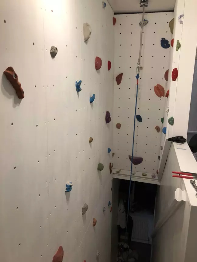 In just five days of hard work, the walls surrounding the staircase have been transformed into a climbing wall with over one hundred handgrips and a safety rope hanging from the ceiling.