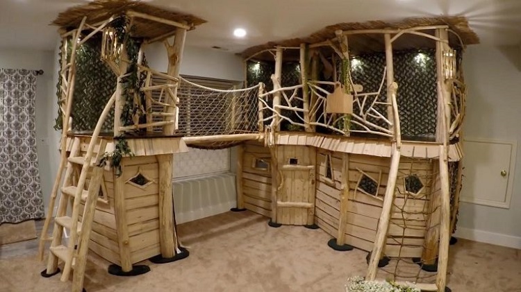 This situation puts a damper on what outdoor activities his children can engage in so he decided to bring one of the staples of outdoor play inside the house by building an indoor wooden tree-house.