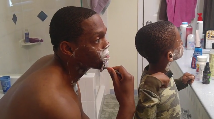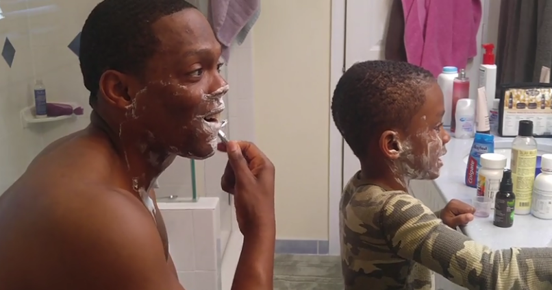 When his dad grooms himself in the morning, the boy wants to stand right in front of the mirror and groom himself like his dad.