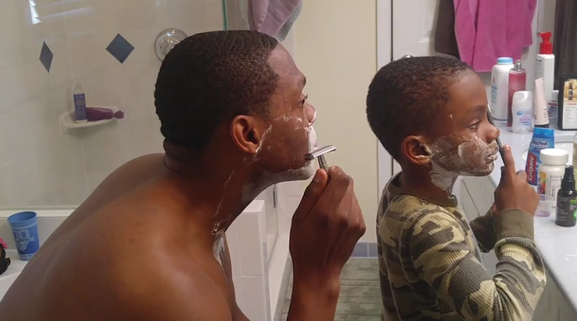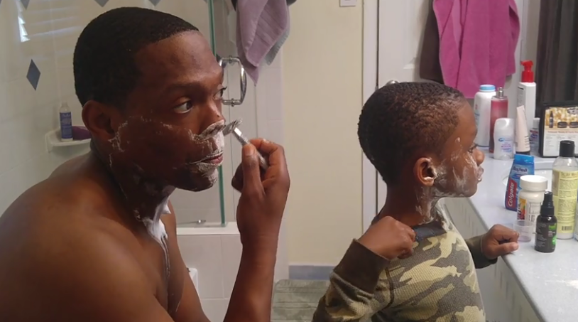 The boy doesn’t seem to be budge if the dad refuses to lather his cheeks. So, the dad budges and lathers up the boy completely and gave him a comb to use instead of the razor.