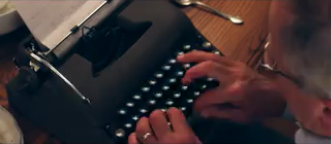 He takes out a typewriter, literally out of nowhere, and starts typing on it. The way he strikes the keys is enough to express his anger and frustration.
