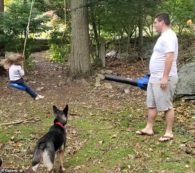 Watch the hilarious video of a dad using a leaf blower to push his daughter on a swing