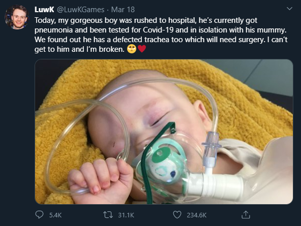 Posting the picture on Twitter, the father wrote: “Today, my gorgeous boy was rushed to hospital, he’s currently got pneumonia and been tested for Covid-19 and in isolation with his mummy.