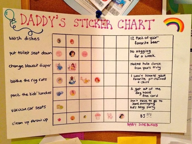 If he vacuums the children’s car seats regularly, there is no need for him to attend ‘annoying’ friend’s birthday party. What’s more, if he cleans up throw up six times, he will get a ‘BJ!!!’