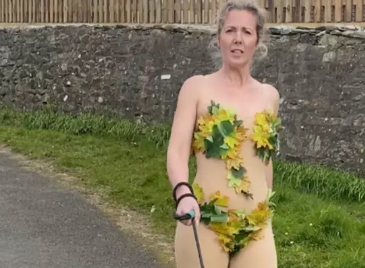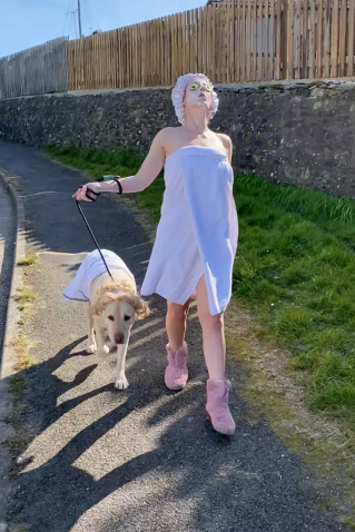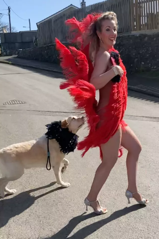 The forty-year-old dancer, Clare Meardon, has been wearing a variety of unusual clothes to walk golden Labrador Hendrix after she was dared by a friend. The clips are filmed by her husband Aidan, and these clips have been seen thousands of times.