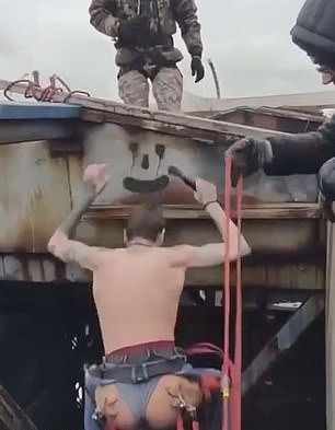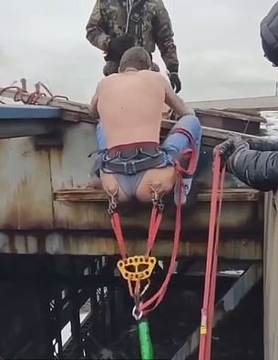 The Russian daredevil then plunged 50ft from the bridge and let out a scream. He then started swinging back and forth, suspended by his four buttock piercings.