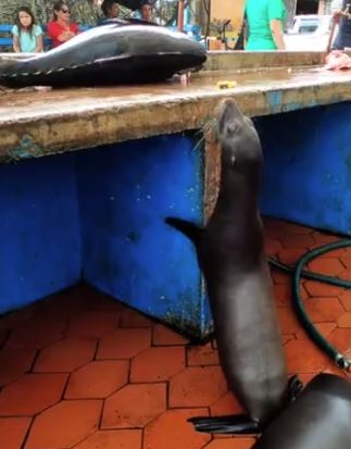 While to hunt for food the sea lions have to go deep in the sea, take a dive and struggle to get a fish, at the market there are plenty.