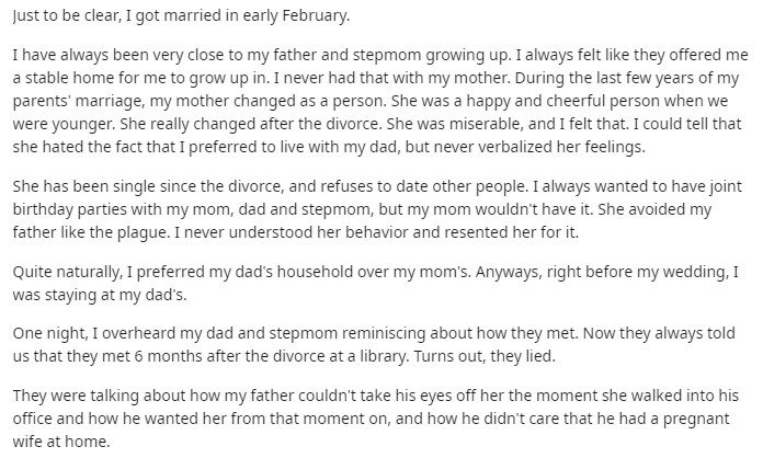 The daughter overheard her dad and stepmom talking about how they met and fell in love with each other when her father was still married to her mother and she was pregnant.