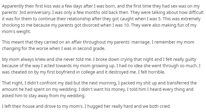 The daughter, who was told that her dad and stepmom met after her parents’ divorce, found out they were having an affair throughout her parents’ marriage.