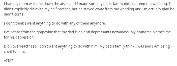 She wrote: “I had my mom walk me down the aisle, and I made sure my dad’s family didn’t attend the wedding. I didn’t explicitly disinvite my half brother, but he stayed away from my wedding and I’m actually glad be didn’t come.”