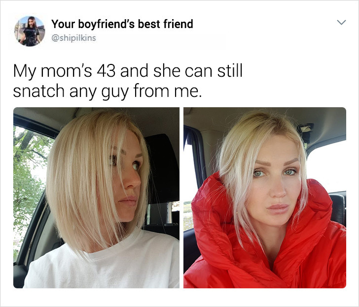The girl whose Twitter name is Your boyfriend’s best friend captioned the photo, ”My mom’s 43 and she can still snatch any guy from me.”