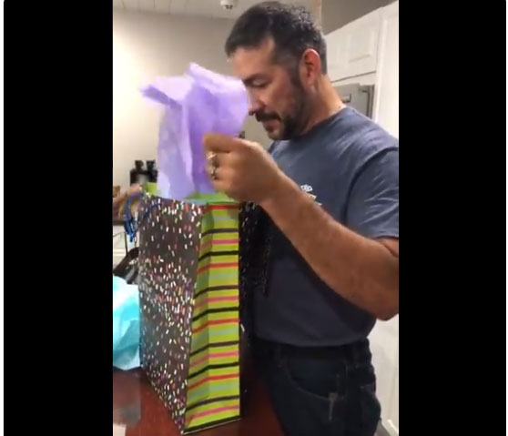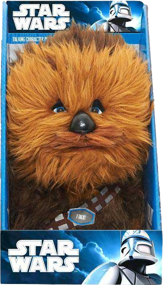 The clip shows as he pulls the paper out, grinning at the bag’s contents. It was a stuffed Wookiee, hairy, bear-like creatures from the “Star Wars” franchise come out.
