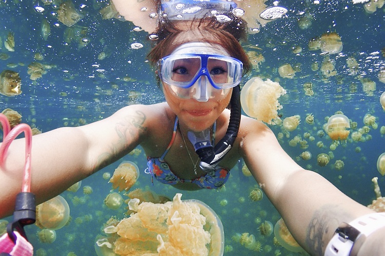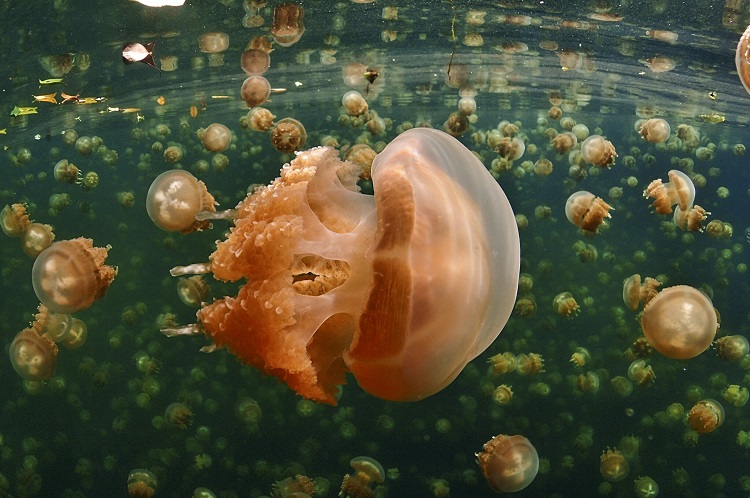 Unlike most other jellyfish, it’s safe to swim among these golden jellyfish.