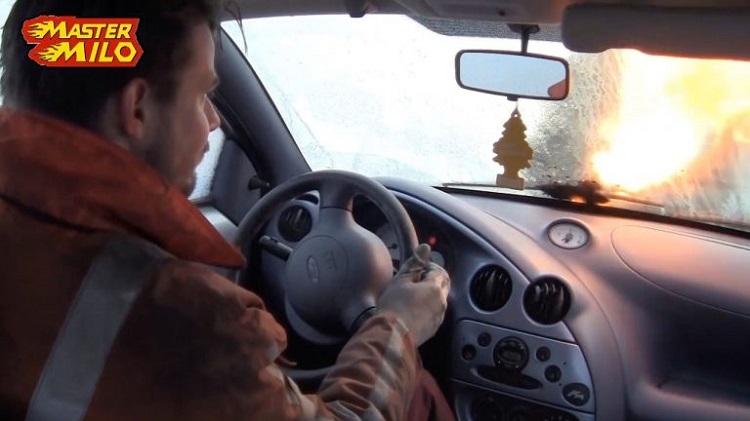 As soon as he gets into the driver’s seat, he fires up – literally – his experiment and a gout of flame immediately cover the windshield. Once the gas burns out, a clear windshield is left behind, fortunately with no cracks. Emile then goes out to douse any remaining flames or embers.