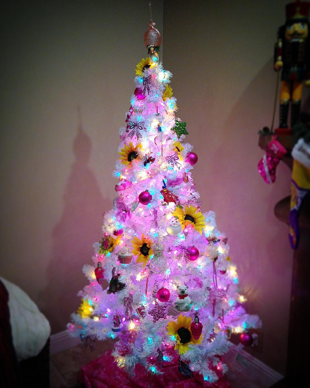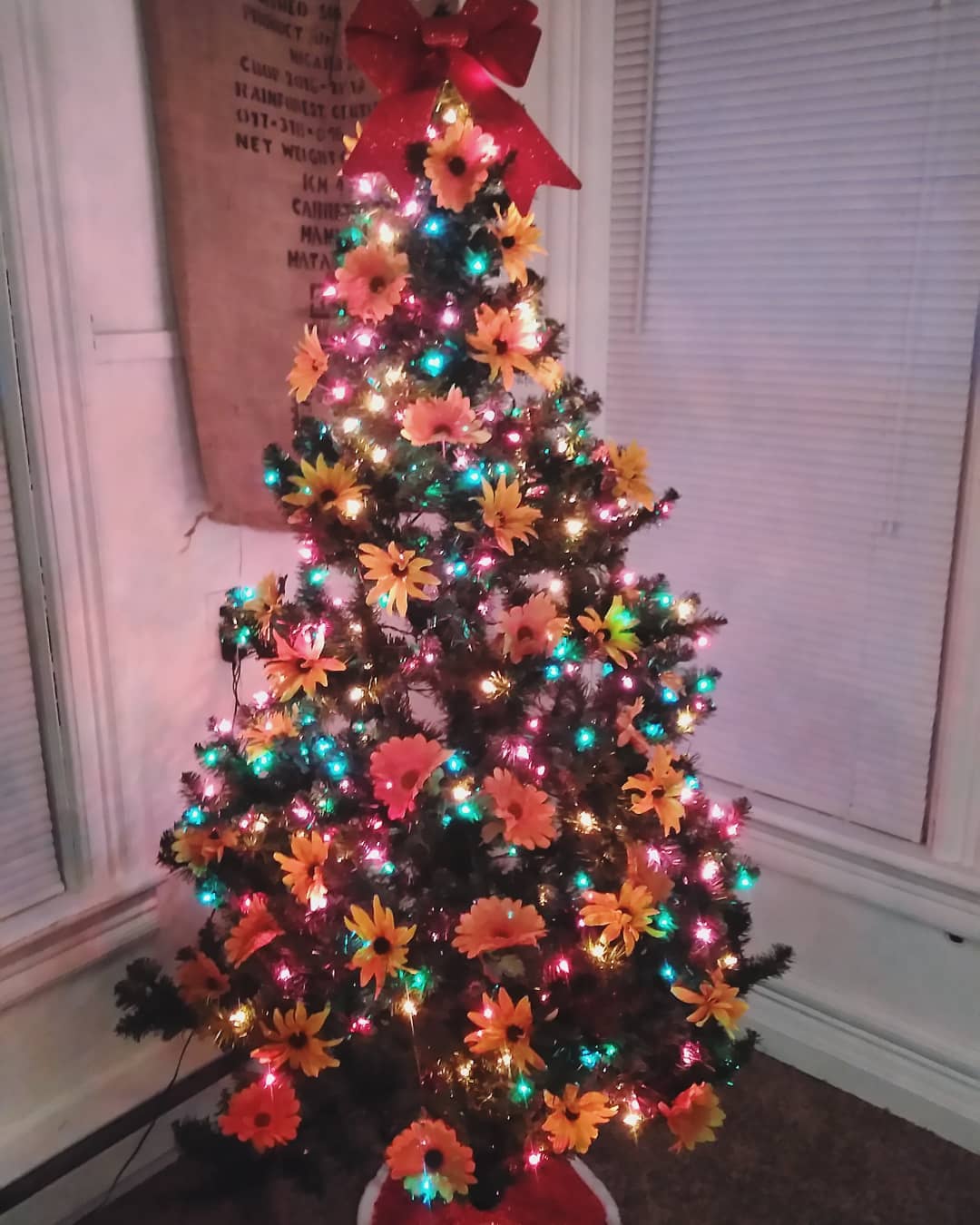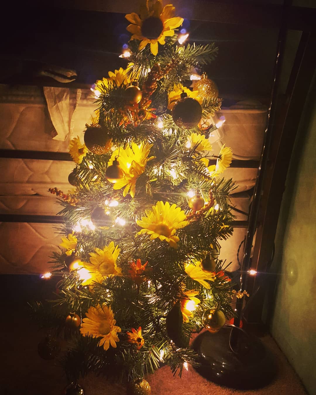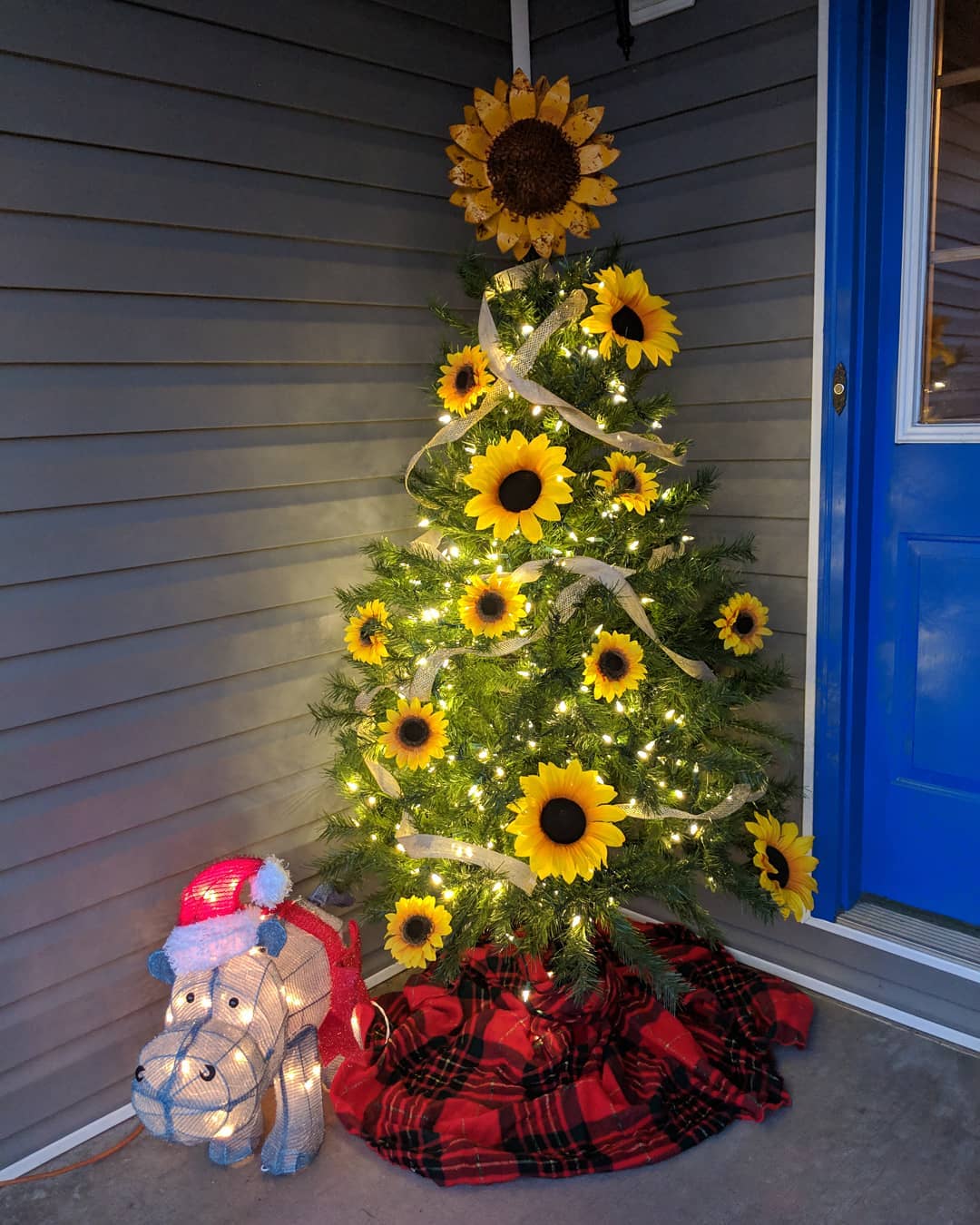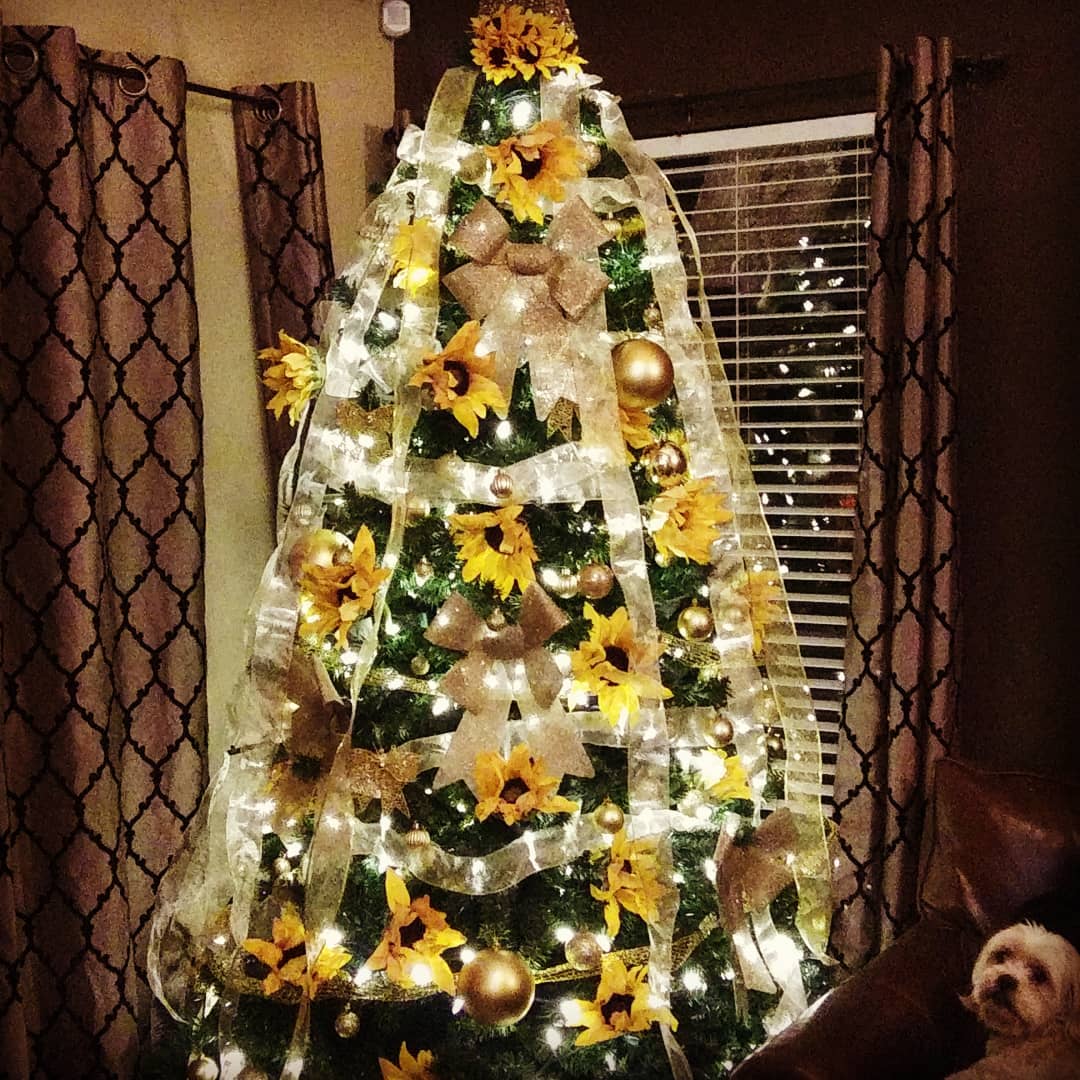 This brings warmth to the holidays that we sometimes miss. Many of the sunflower trees are decorated with gold ribbon and ornaments along with white lights.
