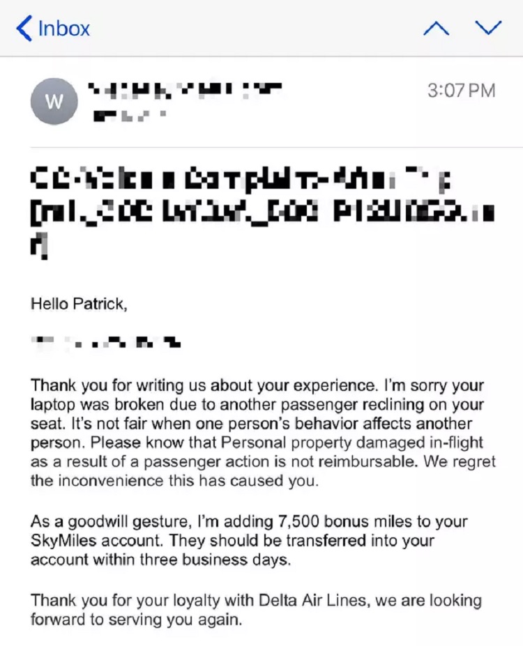 Delta’s response to Pat read: “I’m sorry your laptop was broken due to another passenger reclining on your seat. It’s not fair when one person’s behavior affects another person.